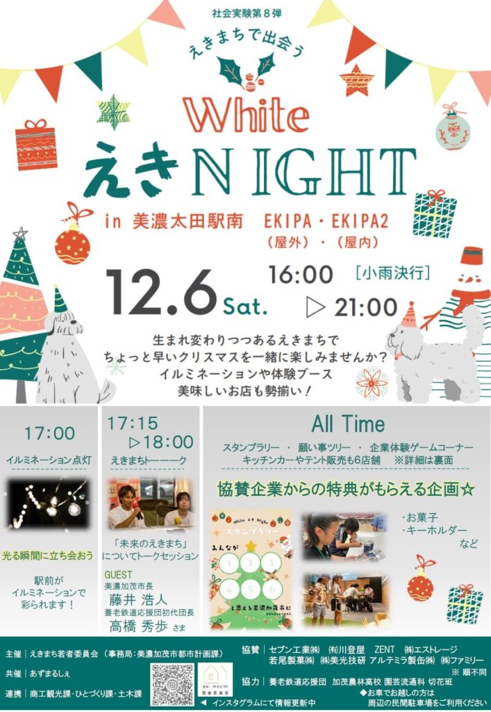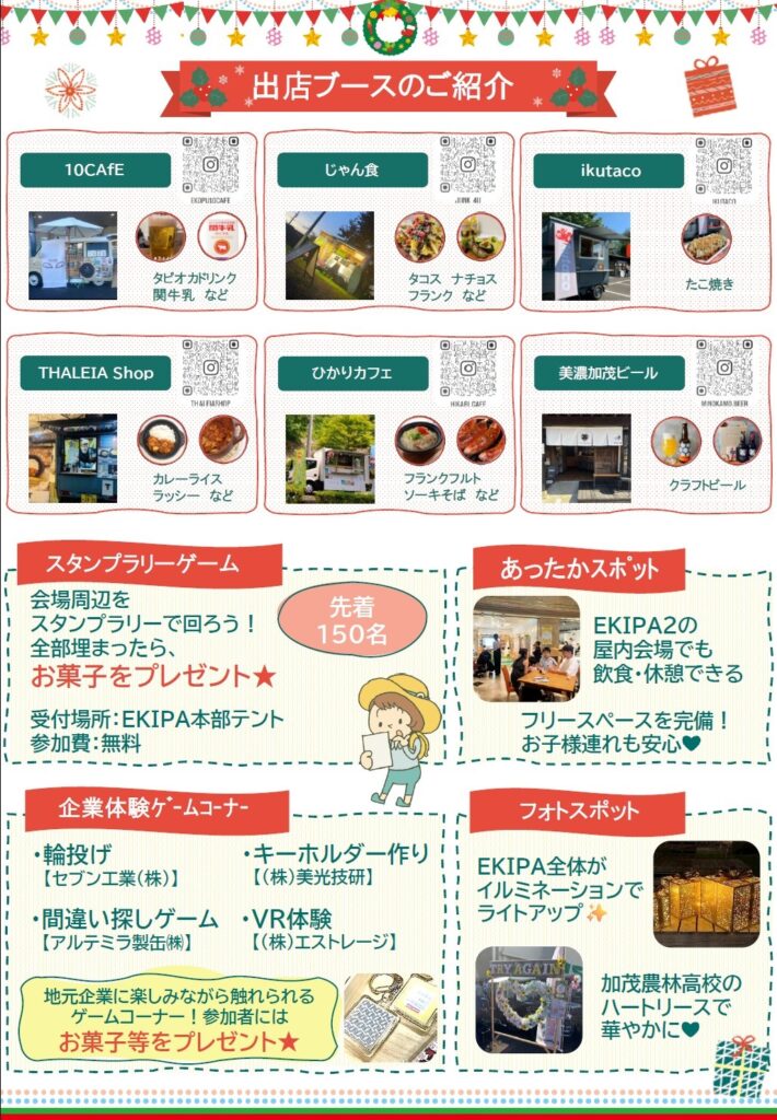 | 内容 | キッチンカー・テント販売、スタンプラリー、ゲームコーナー、フォトスポット、願い事ツリー 17:00 イルミネーション点灯 17:15〜えきまちトーク(ゲスト:美濃加茂市長・養老鉄道応援団初代団長) |
