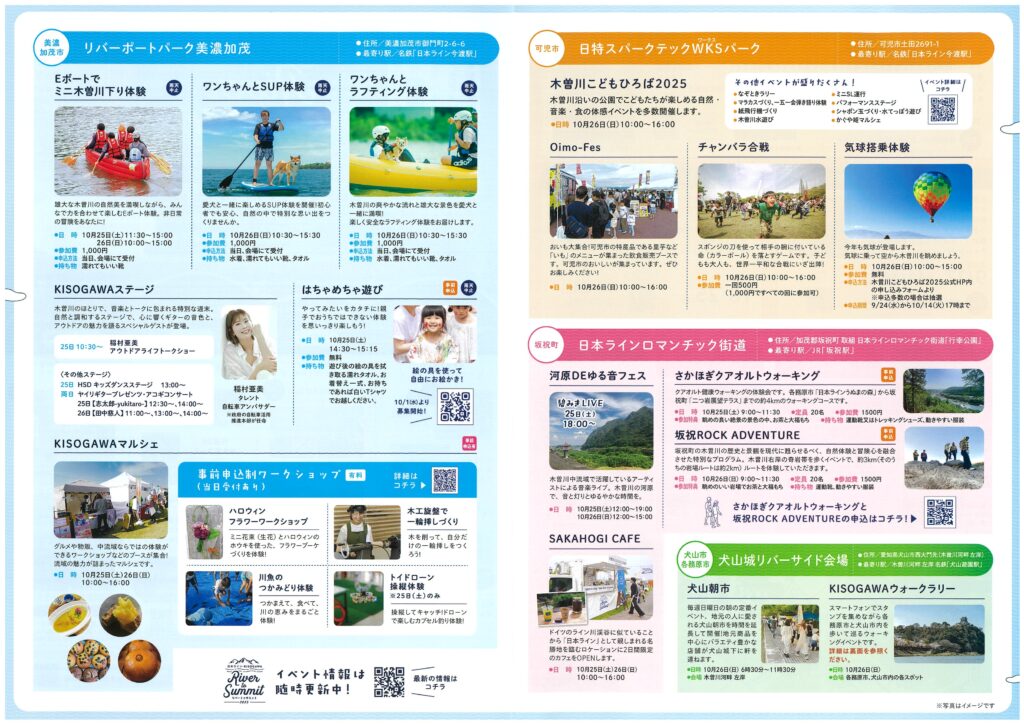 木曽川中流域の4会場を中心に川、山などで、さまざまなアクティビティやマルシェが行われます。