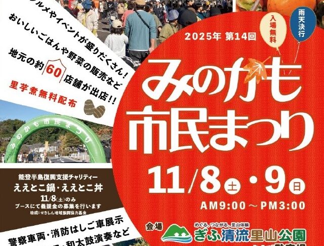 11月8日(土)・9日(日)の2日間、ぎふ清流里山公園にて第14回みのかも市民まつりが開催されます。 美味しい秋の味覚や、美濃加茂市の特産品の他、体験...