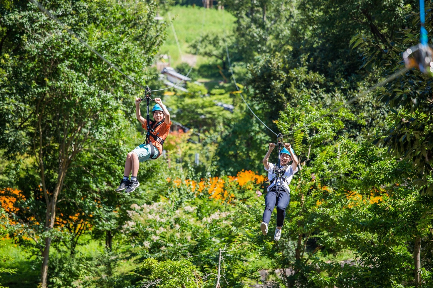 中京地区最長級、全長333mのメガジップラインやスリリングな空中コースを進むエアリアル、小さい子でも安心して遊べるスカイジャムなど、大人も子どもも楽しめます。